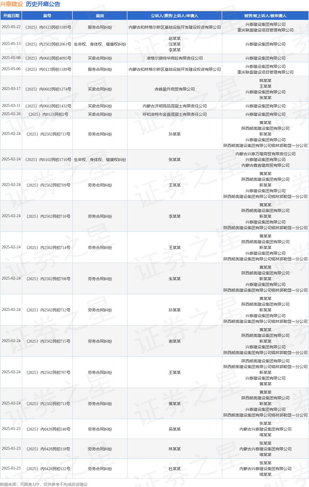 案号:(2025)内2502民初2061号审理法院:锡林浩特市人民法院案由:生命权、身体权、健康权纠纷当事人信息: 原告/上诉人:赵某某、汪某某、李某某 被告/被上诉人:兴泰建设集团有限公司开庭日期:2025年5月13日根据统计,近一年内以兴泰建设集团有限公司为当事人的历史开庭公告有39则,其中案由为“劳务合同纠纷”的公告以12则居首,其次为“买卖合同纠纷”有11则,“建设工程施工合同纠纷”有3则。历史开庭公告(前20条)如下: